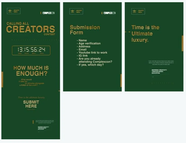 Work with UX/ UI Designers and developers to create a site that would give individuals information about the Soundlabs competition, as well as info on how to submit music, while maintaining SoundLabs and adidas cross collaboration branding.